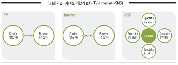 TV는 발신자와 수신자가 명확히 구분되었다면, 인터넷은 발신자와 수신자 사이의 상호 커뮤니케이션이 가능했고 스마트폰, SNS에 이르러 그러한 구분은 무의미하게 되었다.