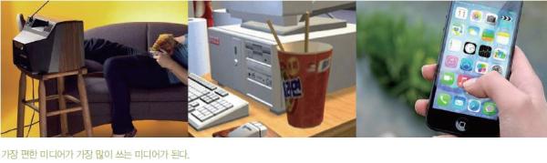 그렇다면 스마트폰은 어떤가. 스마트폰은 그것들보다 훨씬 강력한 물리적 환경을 가지는데, 그것은 바로 내 손이다. 게다가 스낵이나 라면 따위는 굳이 필요 없다. 두 손, 아니 한 손만 있다면 그곳이 어디든 그때가 언제든 아무런 상관이 없다는 것이다.