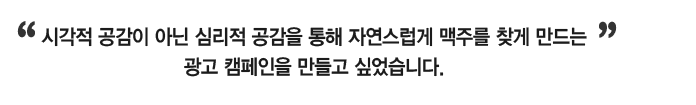 ‘맥주를 맛있어 보이게 포장하는 것만으로 충분한 광고’인가에 대한 의문이 늘 있었습니다. 시각적 공감이 아닌 심리적 공감을 통해 자연스럽게 맥주를 찾게 만드는 광고 캠페인을 만들고 싶었습니다. 기존의 슬로건인 ‘풍미작렬’을 함께 녹여내는 것도 중요한 포인트였습니다.