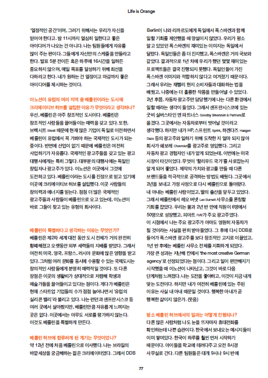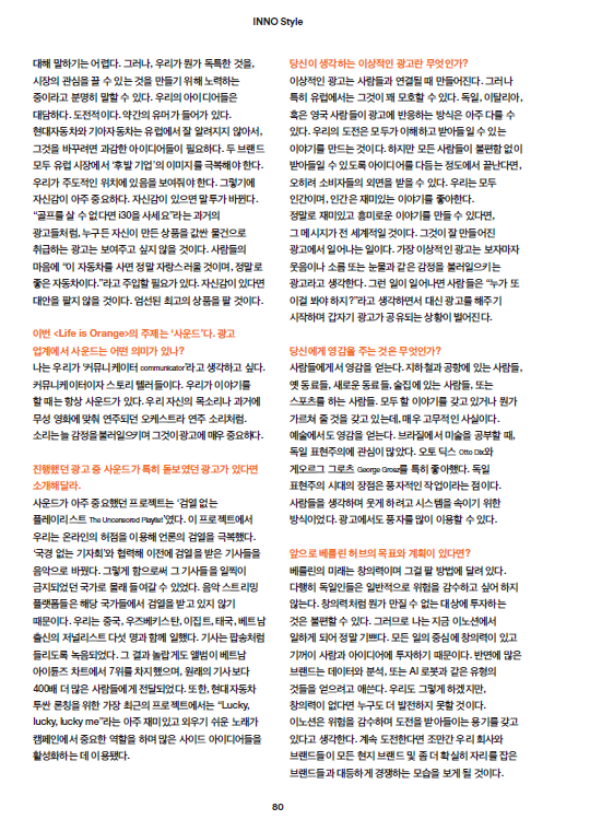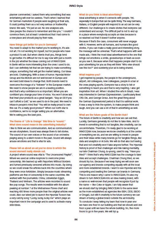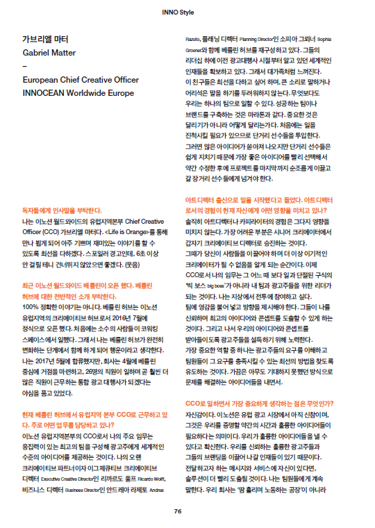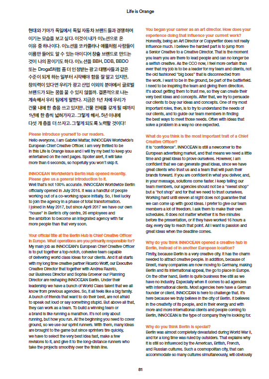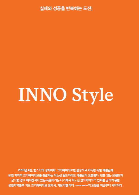 2018년 4월, 힙스터의 성지이자, 크리에이티브한 감성으로 가득찬 독일 베를린에 유럽 지역의 크리에이티브를 총괄하는 이노션 월드와이드 베를린이 오픈했다. 전통 있는 브랜드와 굵직한 광고 에이전시가 있는 독일이라는 나라에서 이노션 월드와이드의 입지를 굳히기 위한 유럽지역본부 치프 크리에이티브 오피서, 가브리엘 마터 Gabriel Matter의 도전은 지금부터 시작이다.