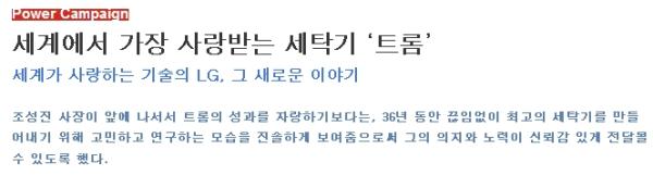 드럼세탁기의 대명사 ‘트롬’의 현 위상이다. 이번 트롬의 새로운 TVC는 이러한 트롬의 성공신화가 36년 동안 오직 세탁기만을 생각해온 조성진 사장의 끊임없는 노력과 집념의 결과임을 고객에게 알리며, 최고의 기술을 향한 LG전자의 노력을 함께 전달하고자 시작됐다. 이러한 메시지의 효과적인 전달을 위해 우리는 좀 다른 생각을 했다. ‘조성진 사장이 직접 모델로 출연하는 것이 좋겠다’는 것이었다.