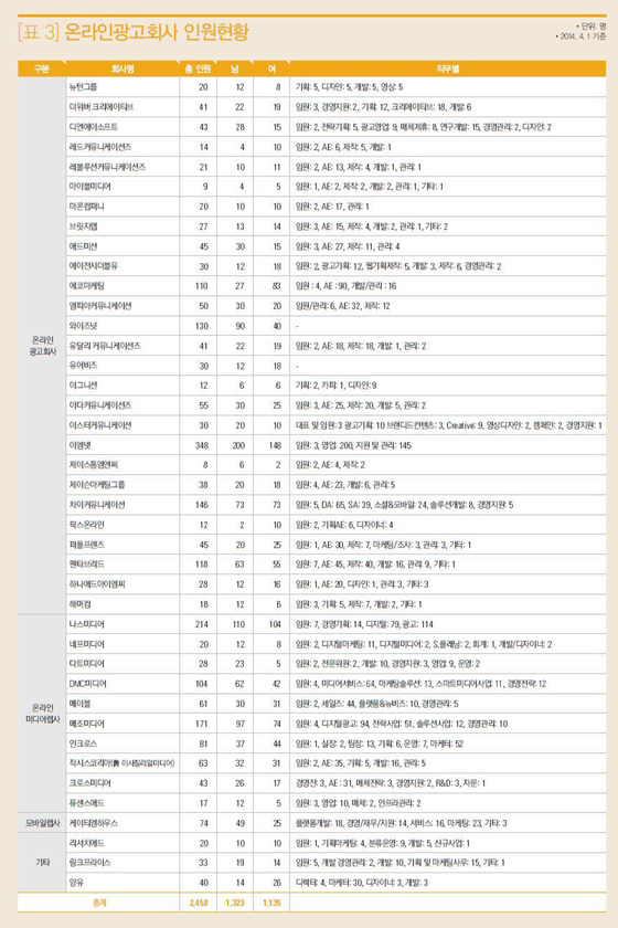 한국광고협회는 지난 3월 31일부터 4월 16일까지 총 17일간 ‘온라인광고회사 현황조사’를 실시했다. 국내 주요 온라인광고회사들의 현황을 파악하기 위해 매년 실시해 온 ‘온라인광고회사 현황조사’를 올해는 문항을 세분화해 각 사별 온라인, 모바일, 기타 취급액을 비롯해 인원현황, 인력 채용현황, 주요 클라이언트 및 프로젝트, 수상현황 등에 대해 조사를 실시했다. 그 결과 총 41개사가 조사에 응답했다.