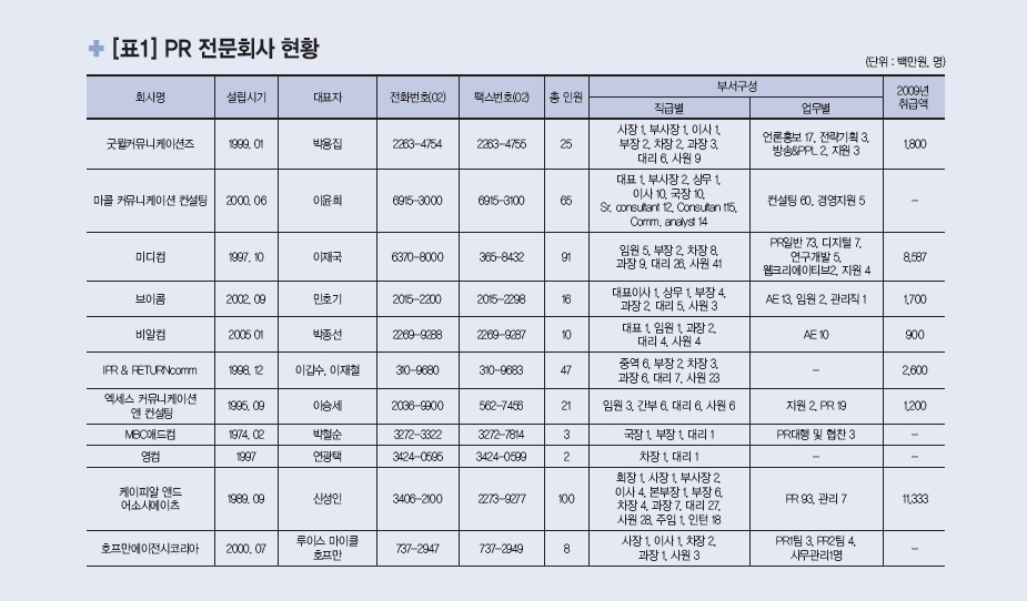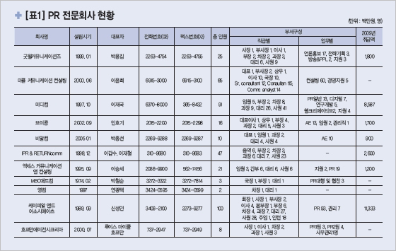 PR영역이 과거 홍보대행 위주에서 PR분야 다양한 모습의 컨설팅으로 전문화되면서 PR 산업도 급격히 팽창하고 있다. 거시적이고 길게 보면 PR산업은 성장일로에 있으며 전체 파이가 커지고 있는 것은 분명하다. 다만 PR도 광고나 프로모션 이벤트업계와 마찬가지로 마케팅의 한 부문이기 때문에 경기에 민감해 지난 2008년 하반기부터 시작된 세계적 경제위기 여파의 영향을 받고 있기는 하다.