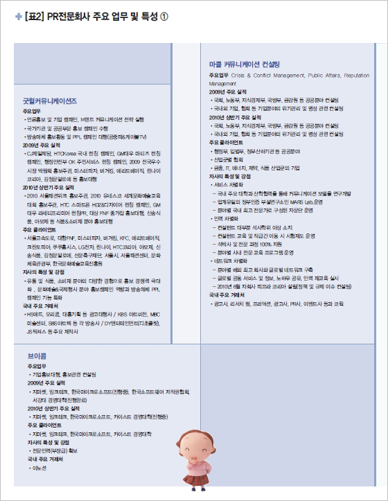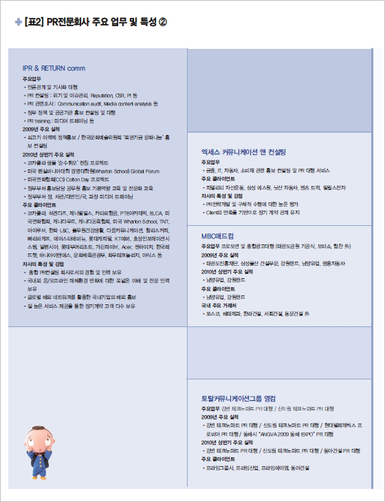 넷째, PR영역의 확대도 PT산업의 전망을 밝게 하고 있다. 과거 홍보대행사 시절에는 클라이언트를 대신해 보도자료를 쓰고 기사화를 위해 언론사에 피칭하는 일을 주로 했지만 이제는 위기관리, 명성관리, CEO PI, IR 등 PR의 전문지식과 경험을 요구하는 고급 PR컨설팅 일이 크게 늘어나고 있다. 로펌이나 경영컨설팅 전문업체가 하던 일 중에서 PR과 관련된 분야는 이제 대부분 PR업체들에게 넘겨지고 있는 단계이다.