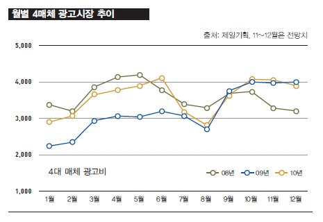 이런 큰 흐름속에서 월별로 4매체의 트렌드를 보면 오랜만에 봄 성수기와 가을 성수기를 산마루로 하는 쌍봉곡선을 보여 주고 있어 광고시장이 경제성장과 함께 정상화되었음을 보여주고 있다. (2011년 1월에 2010년 총광고비를 집계, 발표 예정)
