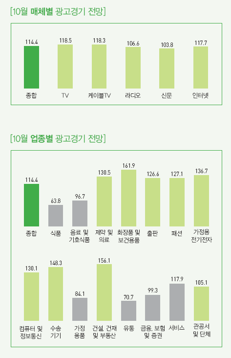 매체별로는 지상파TV 118.5, 신문 103.8, 케이블TV 118.3, 라디오 106.6, 인터넷 117.7로 조사 대상 매체 모두 전월대비 광고비가 증가할 것으로 나타났다. 업종별로는 화장품 및 보건용품(161.9), 건설·건재 및 부동산(156.1), 수송기기(148.3) 등의 업종에서 두드러진 증가세가 예상된다. 그러나 식품(63.8), 음료 및 기호식품(96.7), 가정용품(84.1), 유통(70.7) 업종은 부진이 예상된다.