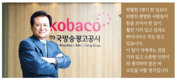 먼저 미디어산업 전체가 격변하고 있는 시대에 광고계의 한 축을 맡고 있는 코바코 사장직을 맡게 되어 막중한 책임감을 느끼고 있습니다. 지난 두 달여 동안 코바코 사장으로 동분서주하면서 해야 할 일이 정말 많다는 것을 새삼 깨닫게 됐습니다. 앞으로 재임하는 동안 코바코의 발전은 물론 우리 광고업계가 한 단계 도약할 수 있도록 제가 할 수 있는 한 모든 노력을 다할 각오입니다.