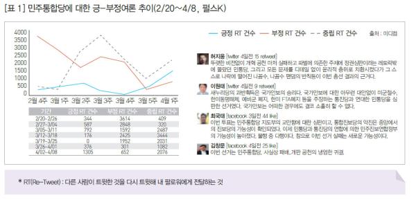 부정 RT * 건수가 13,384회로, 긍정 RT 건수(3,580회)를 4배 이상 압도했다. <표1> 내 사각박스 참조. 민주당이 SNS민심을 제대로 읽어내지 못하는 사이 새누리당은 김무성 백의종군, 뉴라이트연합 공천취소로 응전하며 비교우위에 섰다.