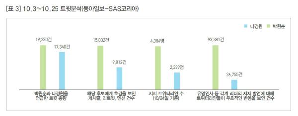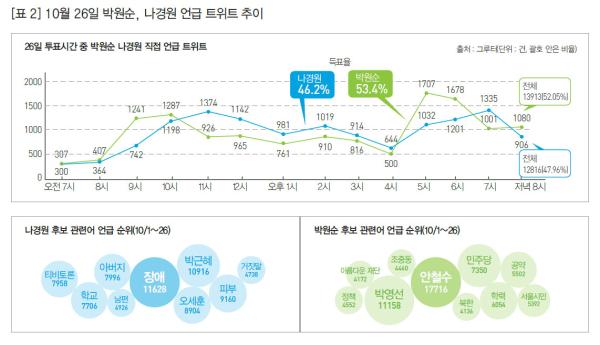 그루터가 분석한 데이터(표2 참조)를 보면, 투표당일 두 후보를 언급한 버즈 점유율은 52:48이었고, 실제 개표결과는 53:46로 비슷한 득표율 추이를 보였다. 특히 동아일보-SAS코리아가 발표한 두 후보를 언급한 트윗언급량 및 내용분석(표3 참조)을 보면, SNS민심은 박원순 후보에게 두 배 이상의 호감도를 보인 것으로 나타났다. 소셜민심은 박후보의 승리를 미리 예견했다. 투표를 일주일 앞두고 발표한 중앙일보-갤럽 여론조사는 45.9:42.3으로 나후보 승리를 점쳤고, 대다수 여론조사가 비슷한 결과를 내놨다. 양자대결 구도로 펼쳐지는 대선에서 SNS민심이 주요한 변수가 될 수 있음을 보여주는 실 사례다.