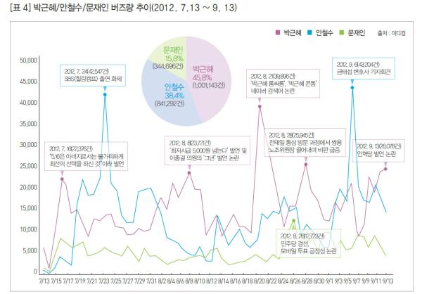18대 대선은 SNS민심이 결과에 영향을 미칠 수 있는 최적의 환경이다. 246개 지역구로 논점이 분산되는 총선과 달리 두 사람에게만 집중할 수 있기 때문이다. 일찌감치 후보를 확정한 여당에 맞서 야권에서 국민눈높이에 맞춘 후보결정과 이후 대선캠페인에서 극적 드라마를 연출한다면 SNS민심은 크게 요동칠 것으로 전망된다. 참고로 유력대선후보 3인의 최근 두 달간 트윗버즈 총량을 붙이니 판세를 읽는데 도움이 되길 바란다. 이 자료는 미디컴이 소셜여론분석엔진 ‘펄스K’를 통해 분석한 것이다.