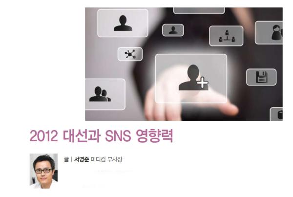 “SNS가 다가오는 대통령선거 결과에 영향을 미칠 것으로 보느냐?”는 질문을 많이 받는다. 내 답은 “물론입니다.”이다. 영향을 미치는 정도가 아니라 핵심변수가 될 것으로 본다. 근거는 세 가지 정도다. 하나는 트위터리안들의 주된 관심사가 무엇이냐는 것. 둘은 스마트 디바이스가 몰고 온 정보유통구조의 변화다. 셋은 민심 흐름을 읽어내는 검증된 수단이라는 점이다.