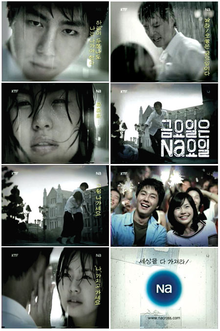 Na 모델인 조인성과 하지혜가 70년대풍의 대학생 옷차림으로 대학교정에 서 있다. (70년대 흑백영화 같은 한 장면...) 비가 추적추적 내리고 조인성이 캠퍼스 밖으로 나가려 하자 하지혜가 못나가게 붙잡는 장면이 연출된다. 조인성이 하지혜를 뿌리치며 하는 말 "하늘이 두쪽나도 나는 나가야 한다. " 하지혜가 흑흑 울면서 대답한다. “그럼, 나가세요” 이 때 갑자기 화면이 컬러로 확 바뀌고 발랄한 신세대 대학생 차림의 조인성과 하지혜가 방금전의 상황을 영화관에서 영화로 보고있는 장면이 연출된다. 그리고 자막이 흐르고.. "전국 25개 영화관 무료. TGIF 케이준 치킨샐러드 무료" 등 금요일은 Na요일. 금요일에는 큰 혜택들이 있다. 는 점을 강조하고 있다.