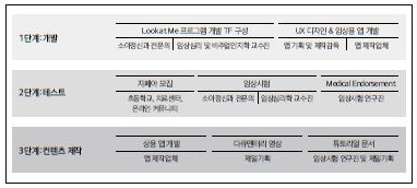 우리는 아래 그림과 같이 3단계로 룩앳미 개발 계획을 수립했습니다. 전문가들과 협업해 프로그램 개발팀을 구성하고, 자폐아의 눈 맞춤과 소통 능력을 키울 훈련 미션을 여러 차례의 회의를 통해 결정했습니다. 눈 맞춤 훈련을 위해서 연세대 정상철 교수(심리학, 비주얼인지공학 전문)와 정경미 교수(자폐증 진단·평가 전문)팀에서 제안한 ‘얼굴인식능력 증진’을, 자폐 청소년을 대상으로 사회기술훈련 프로그램(PEERS)을 진행 중인 유희정 교수(분당 서울대병원 정신건강의학과)가 오랜 진료 경험을 바탕으로 제공한 아이디어를 통해 소통 능력 증진 기능을 구현했습니다.