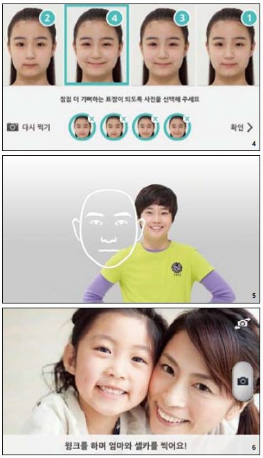 임상시험용 앱을 2013년 11월부터 약 8개월간 제작했고, 앱의 7개 미션은 최대한 심플하게 정리했지만, 그 외는 마치 게임처럼 즐길 수 있도록 좋아하는 캐릭터를 테마로 GUI를 구성하거나 랭킹 및 레벨 시스템 도입, 보물상자 기능, 적절한 효과음 등을 적용했습니다. 자폐아의 눈 맞춤과 소통 능력 향상을 위한 본격 미션은 총 7가지인데요, 표정 읽기 훈련 ‘순서대로 착착착’은 감정이 드러난 얼굴의 표정 변화를 학습하고, 자신의 표정을 자연스럽게 짓는 법을 익힙니다. 타인 얼굴 바라보기 훈련 ‘얼굴 캡처하기’는 타인의 얼굴을 포착하는 과제를 수행하면서 얼굴을 인지하고 바라보는 능력을 향상시키는 것입니다. 감정과 의사 표현하기 훈련인 ‘이럴 때 어떤 표정’은 자신의 감정 표현을 돕는 과제입니다. 주어진 상황에 맞게 기쁨, 슬픔, 분노, 실망 등의 표정을 학습하게 되고, 이 외에도 ‘분위기 파악하기’, ‘누구였을까’, ‘날 따라해 봐요’, ‘함께 찍어요’라는 과제가 주어집니다. 각 과제를 성공적으로 수행 시 점수가 누적되고, 일정 점수에 도달하면 예쁘고 멋진 캐릭터를 획득하게 되는 것이죠. 이런 장치로 사용자들은 게임하듯이 훈련에 참여하게 됩니다.